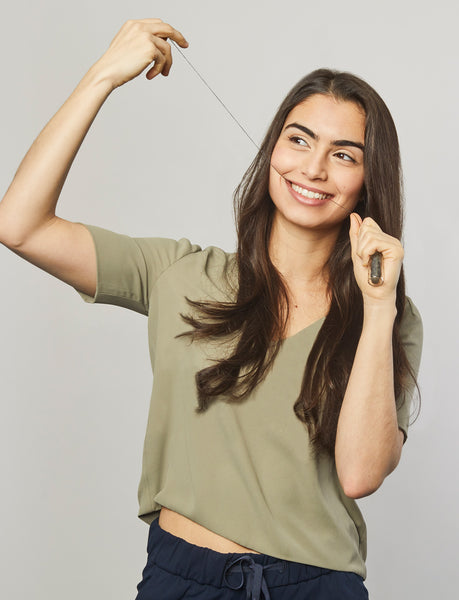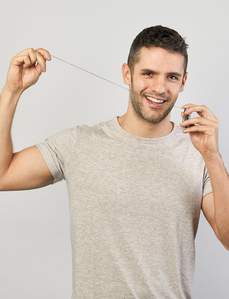 This 30 metres natural dental floss is made with Charcoal Fibres, a reduced amount of Polyester Yarn, Candelilla Wax and Peppermint Oil. It comes with a reusable glass flint and metal dispenser, packed in a fully compostable Kraft box. Save the dispenser and used again and again with our Floss Refills.
